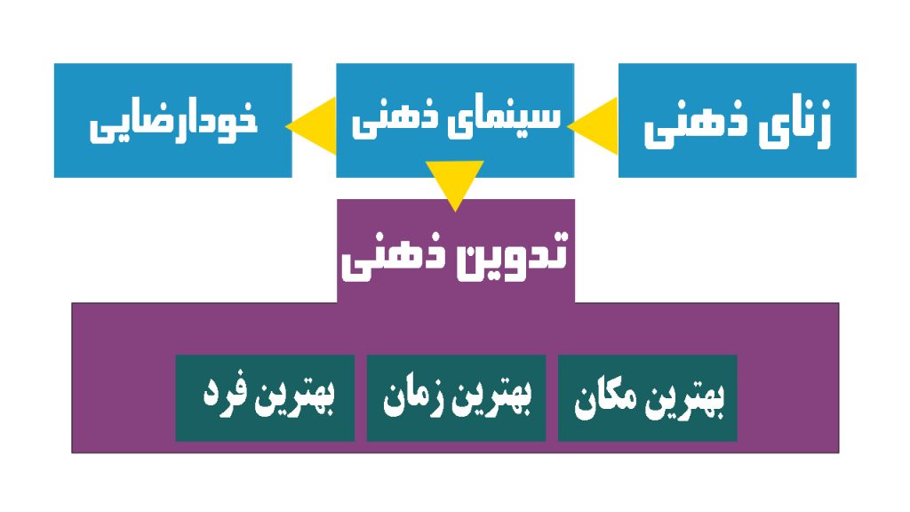خب تصویرش رو میتونید ببینید که شامل زنای ذهنی سینمای ذهنی و خودارضایی میشه زنای ذهنیم سعی میکنه سینمایی توی ذهنمون ایجاد کنه این فیلم سینمایی توسط ذهن شما تدوین میشه توی بهترین مکان و بهترین زمان و بهترین فرد که این تحت تاثیر تجربیات شماست جاهایی که رفتید فیلم هایی که دیدید شما باید از اون ها جلوگیری کنید از این موضوع به هیچ عنوان دید جنسی به هیچ چیز نداشته باشید برای اینکه بتونید ذهن جنسی خودتون رو کنترل کنید باید بتونید تمام تفکر خودتون رو کنترل کنید پس سعی کنید به هر چیزی فکر نکنید ذهنتون توی دست خودتون باشه و فقط به موضوعات مهم فکر کنید این تمرین میتونه بهتون کمک کنه یا تمرکز کردن روزانه روی یک موضوع برای چند دقیقه می شه گفت: نماز بهترین روش برای کنترل ذهن که شما روزانه نزدیک به هفده دقیقه فقط به خداوند باید فکر کنید و این باعث میشه مدیریت ذهنتون توی دست خودتون بیافته.