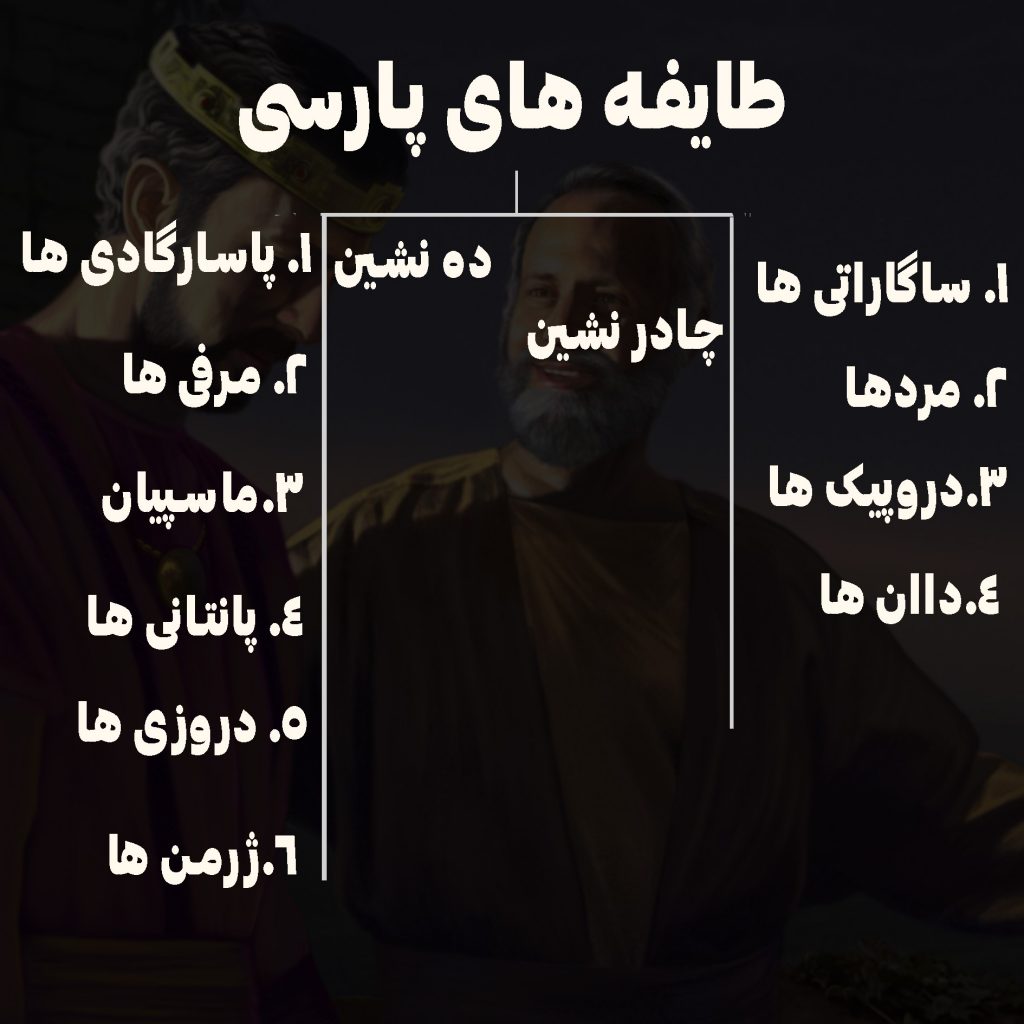 پارسی ها به شش طایفه ی شهری و ده نشین چهار طایفه چادر نشین تقسیم شده اند.